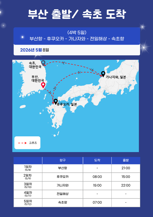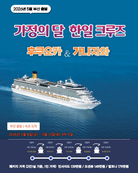 2026년 가정의 달 한·일 크루즈 4박 5일 “부모님과 함께 떠나는 바다 위 효도여행” [후쿠오카·가나자와|부산출발/속초도착]