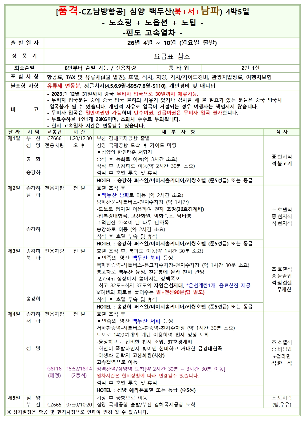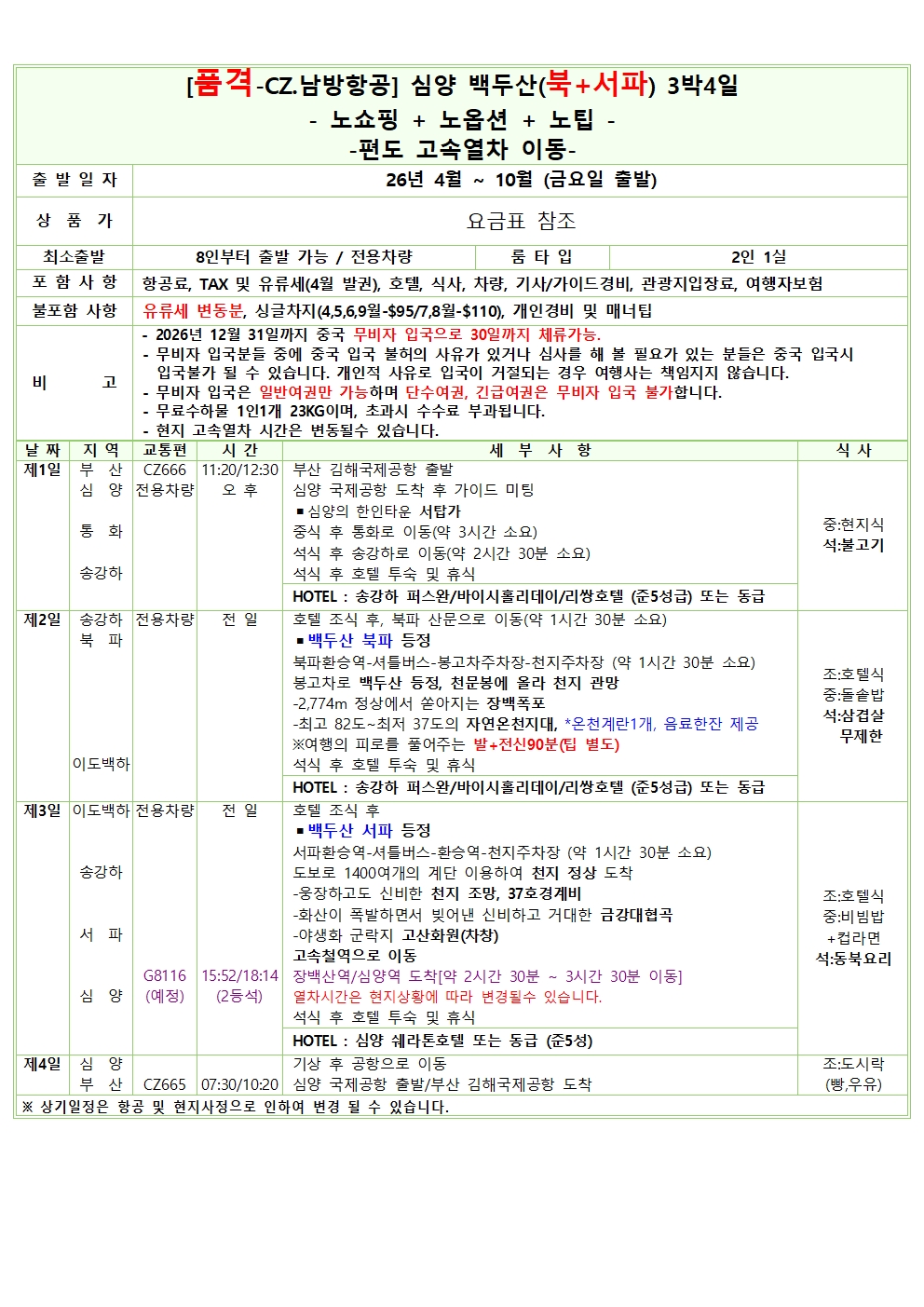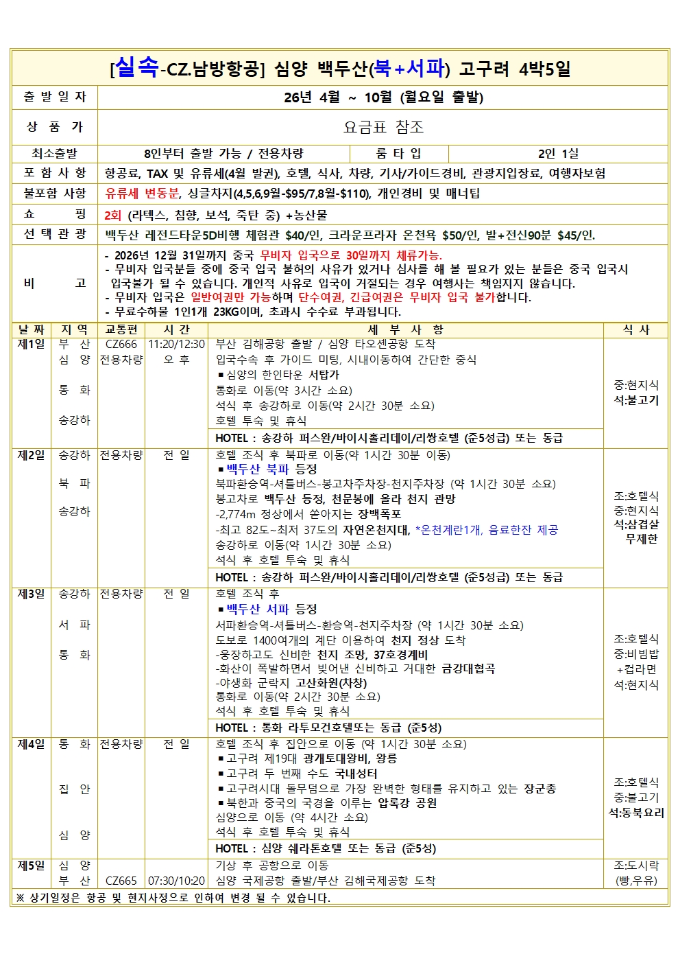 실속 상품 = 왕복 항공료 및 텍스, 유류할증료(2월기준), 호텔, 차량, 가이드, 관광지입장료, 식사, 2억원여행자보험