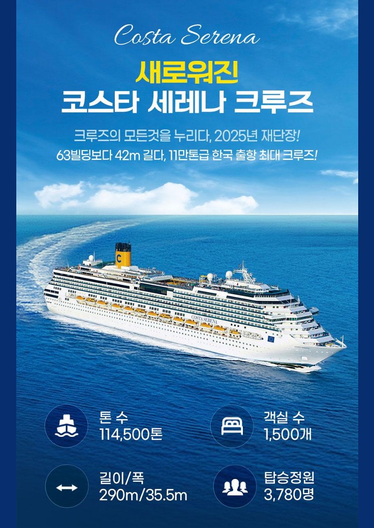 [서산출발] 6월13일 출발확정 한국. 일본. 대만. 3개국 크루즈 '코스타 세레나호'로 떠나는 7일 “바다 위에서 시작되는 가장 품격 있는 여행” [럭셔리 크루즈]