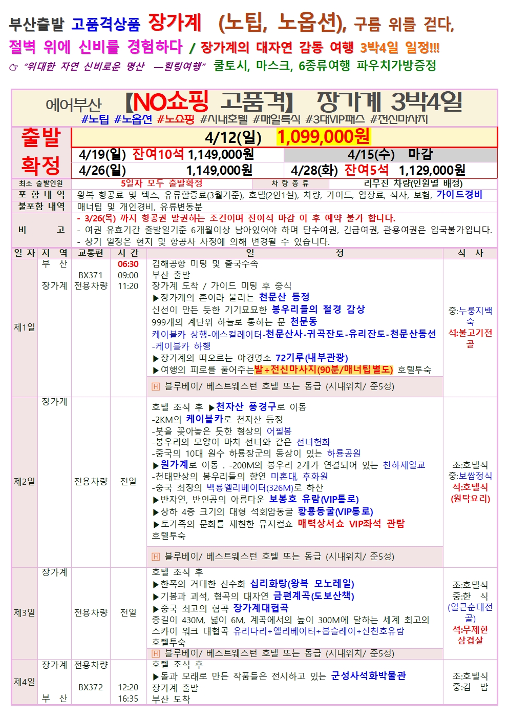 [부산출발] 장가계 대자연의 감동 위대한 절경 모아모아! 4일.5일