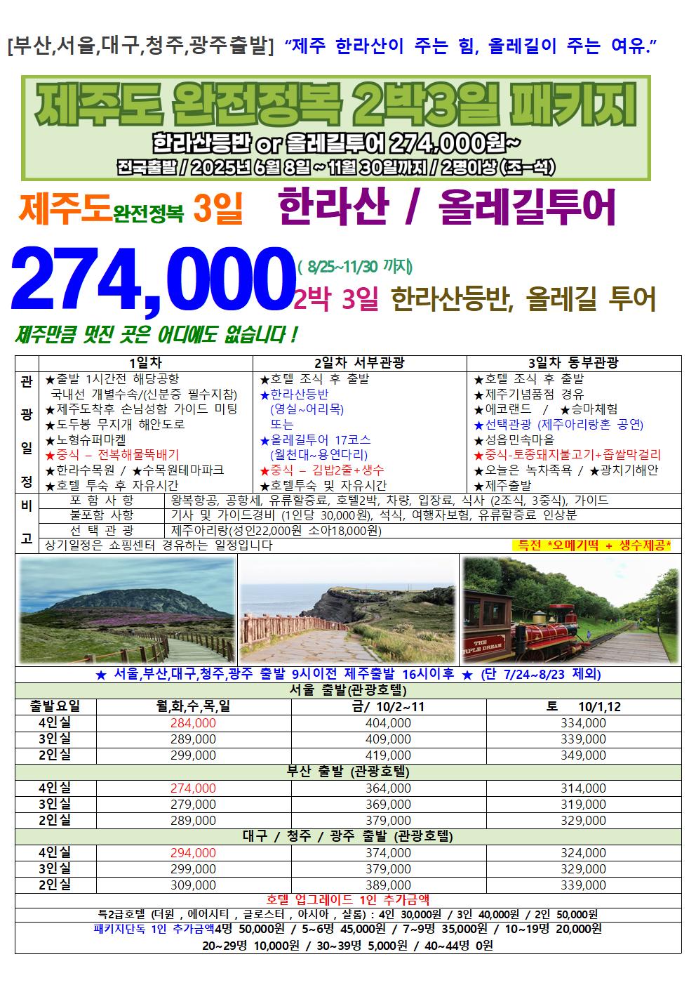 [서울, 울산, 대구, 청주, 광주, 부산 출발] 제주도 3일 “제주 한라산이 주는 힘, 올레길이 주는 여유.”한라산+올레길 멋진 아름다움을 느껴보자!!!