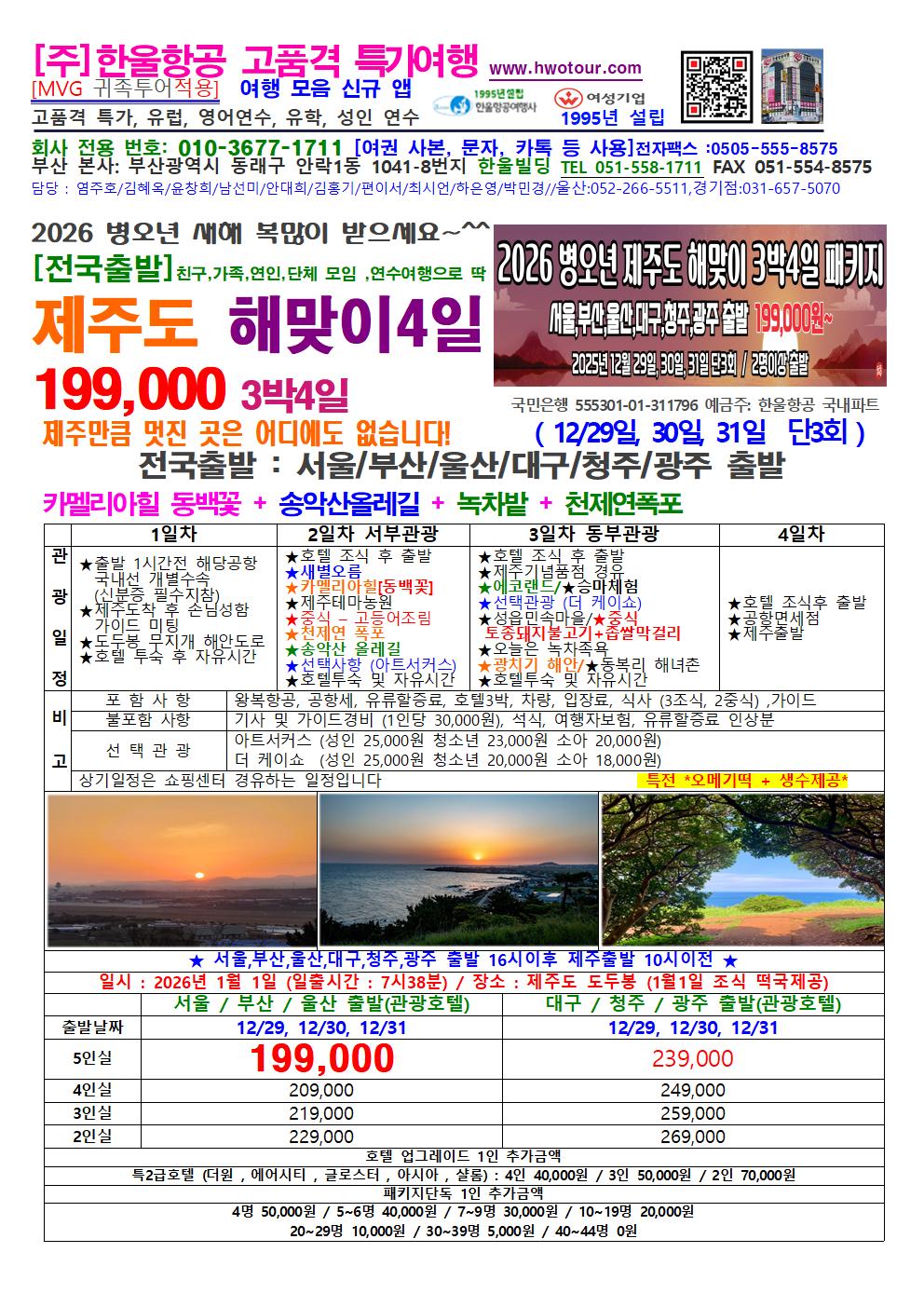 [전국 출발] 제주도, 너는 해맞이 어디서 보내고 싶니!!! 제주도 병오년 해맞이 행사 3박 4일 특가 패키지 12월 연말 단 3회!!!