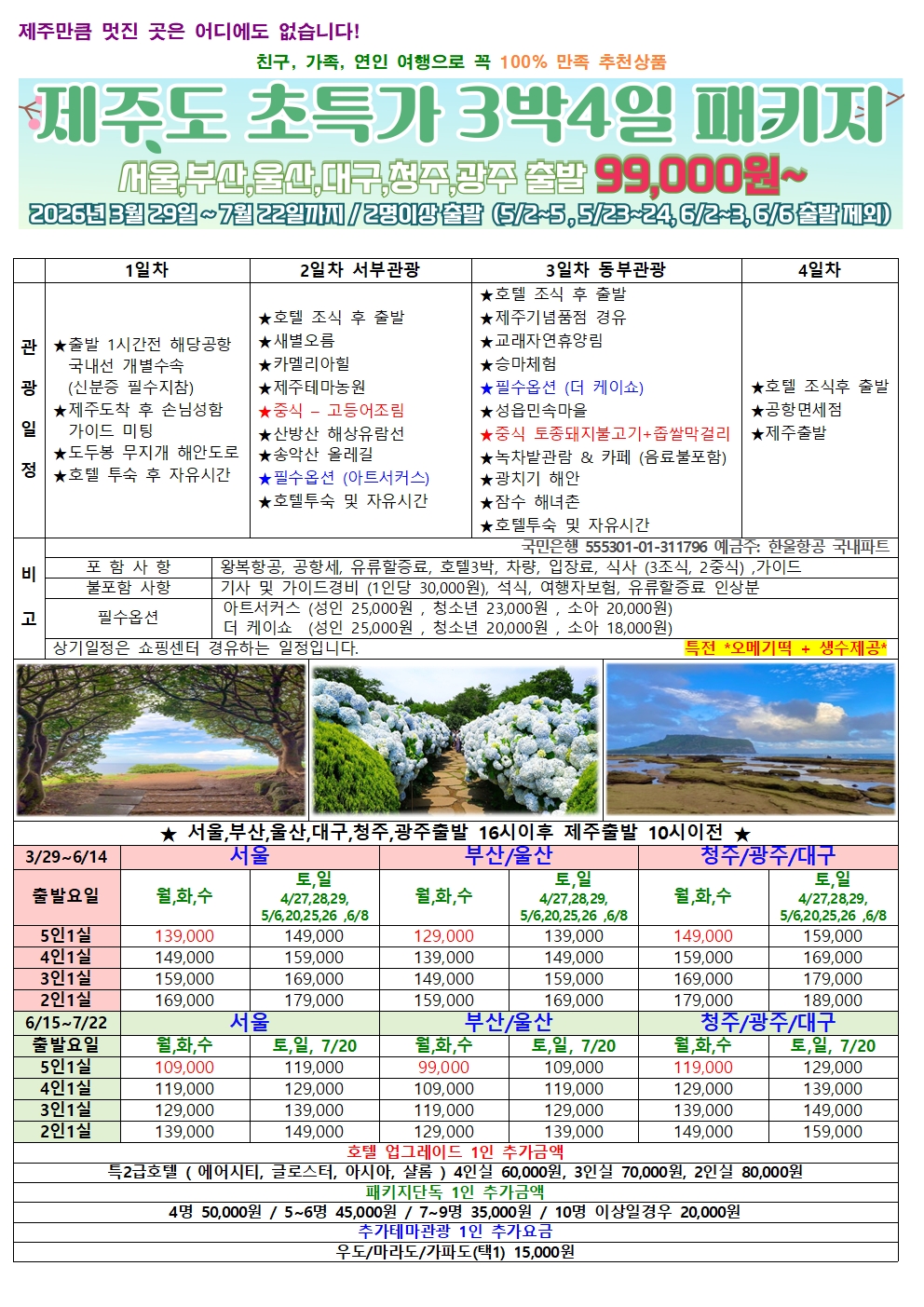 [전국출발] 제주도 12가지 상품 2일/3일/4일 일정 (노팁,노옵션,노쇼핑)